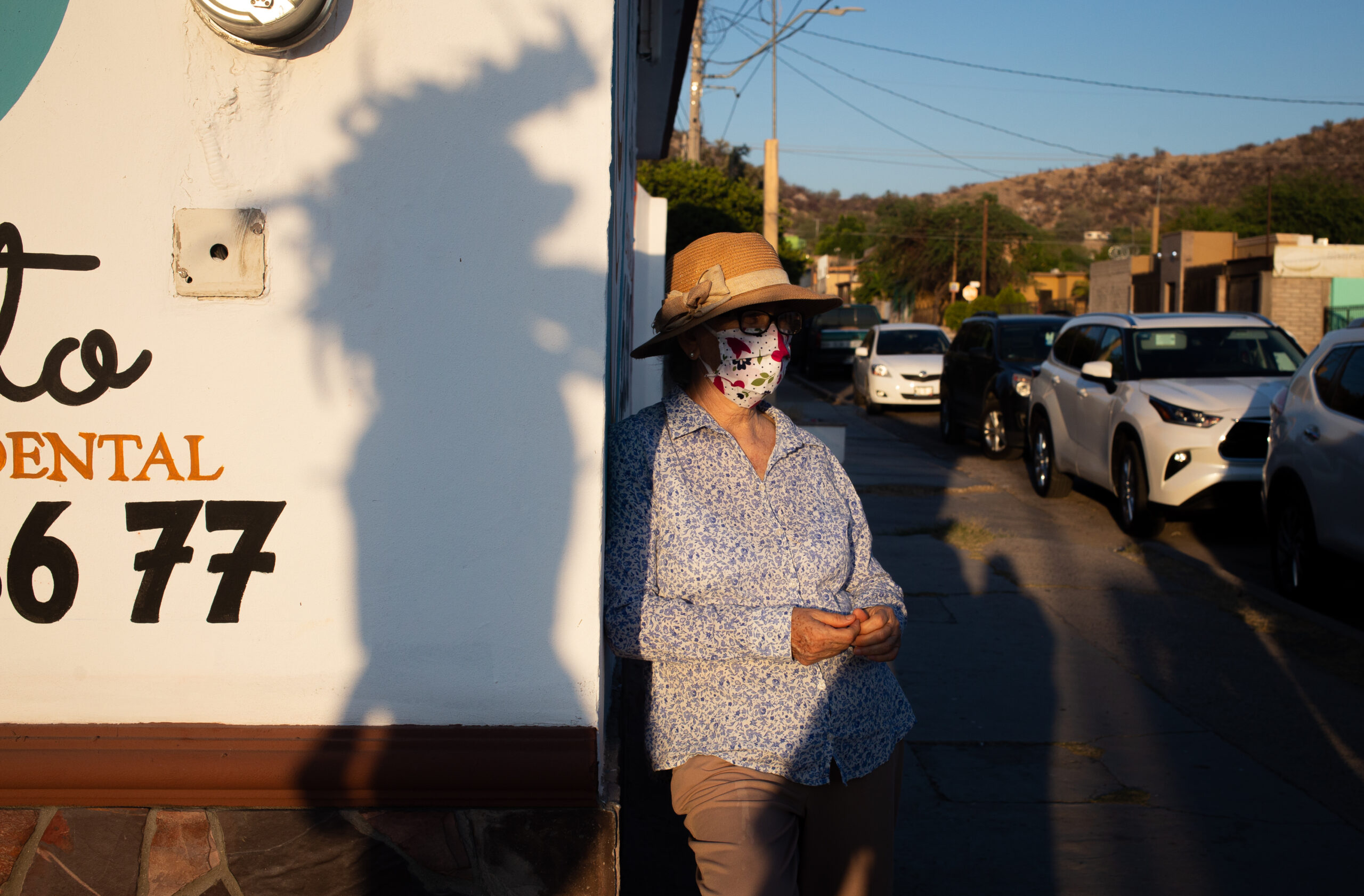 An older person wearing a hat and floral face mask leans against a sunlit wall on a sidewalk beside parked cars in a residential area.